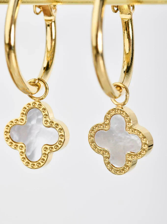 Beautiful earrings with a hanging clover with the addition of mother of pearl, made of surgical / stainless steel, gold-plated with 14-carat gold applied using the PVD method - currently the most durable coating method. Diameter of the circle approx. 2 cm, diameter of the clover approx. 1.1 cm. Clasp type: pin fastener. Color: gold. The clover is a movable element, you can wear the earrings in two ways: just hoops or hoops with a clover. A perfect addition to everyday styling.