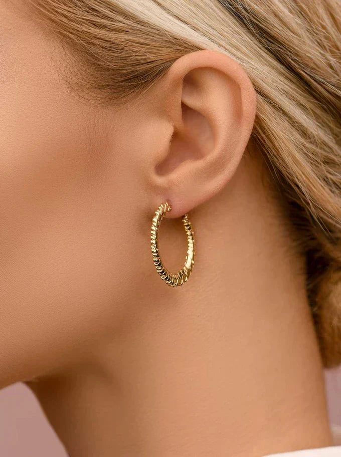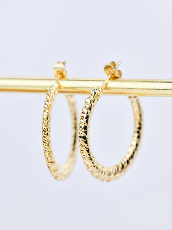 Hoop earrings, made of surgical / stainless steel, gold-plated with 14-carat gold applied using the PVD method - currently the most durable method of coating. Earring diameter approx. 3 cm. Clasp type: pin. Color: gold. A perfect addition to everyday styling.