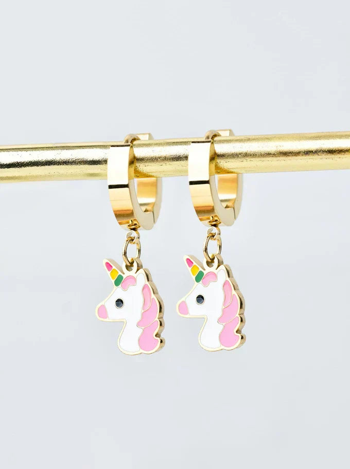 A jewelry set containing a gold-colored necklace and earrings with a unicorn motif. Necklace on a chain, length 40+5 cm, hanging earrings. Material: enamel, surgical steel.